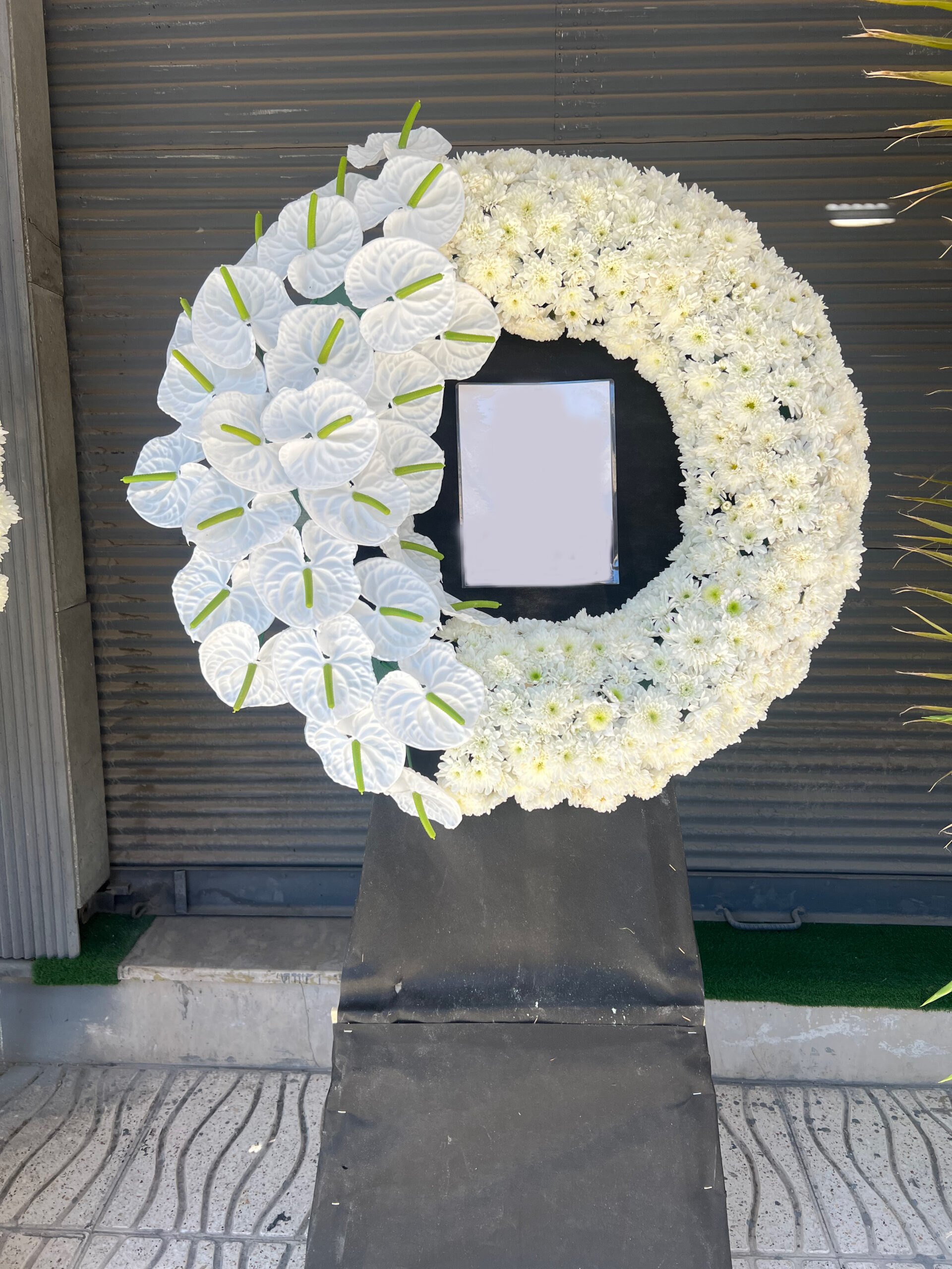 در طراحی این اثر فاخر، گل‌های داودی سفید و آنتریوم‌های براق و استوار با هارمونی رنگی مینیمال و جلوه‌ای رسمی کنار یکدیگر نشسته‌اند. داودی نماد یاد جاودان و آرامش ابدی است، در حالی که آنتریوم تجلی احترام و عشق خالص در سکوتی بی‌انتهاست. ترکیب این دو گل، تصویری از خلوص، وقار و آرامش روح را در تاجی درباری‌گونه خلق می‌کند.