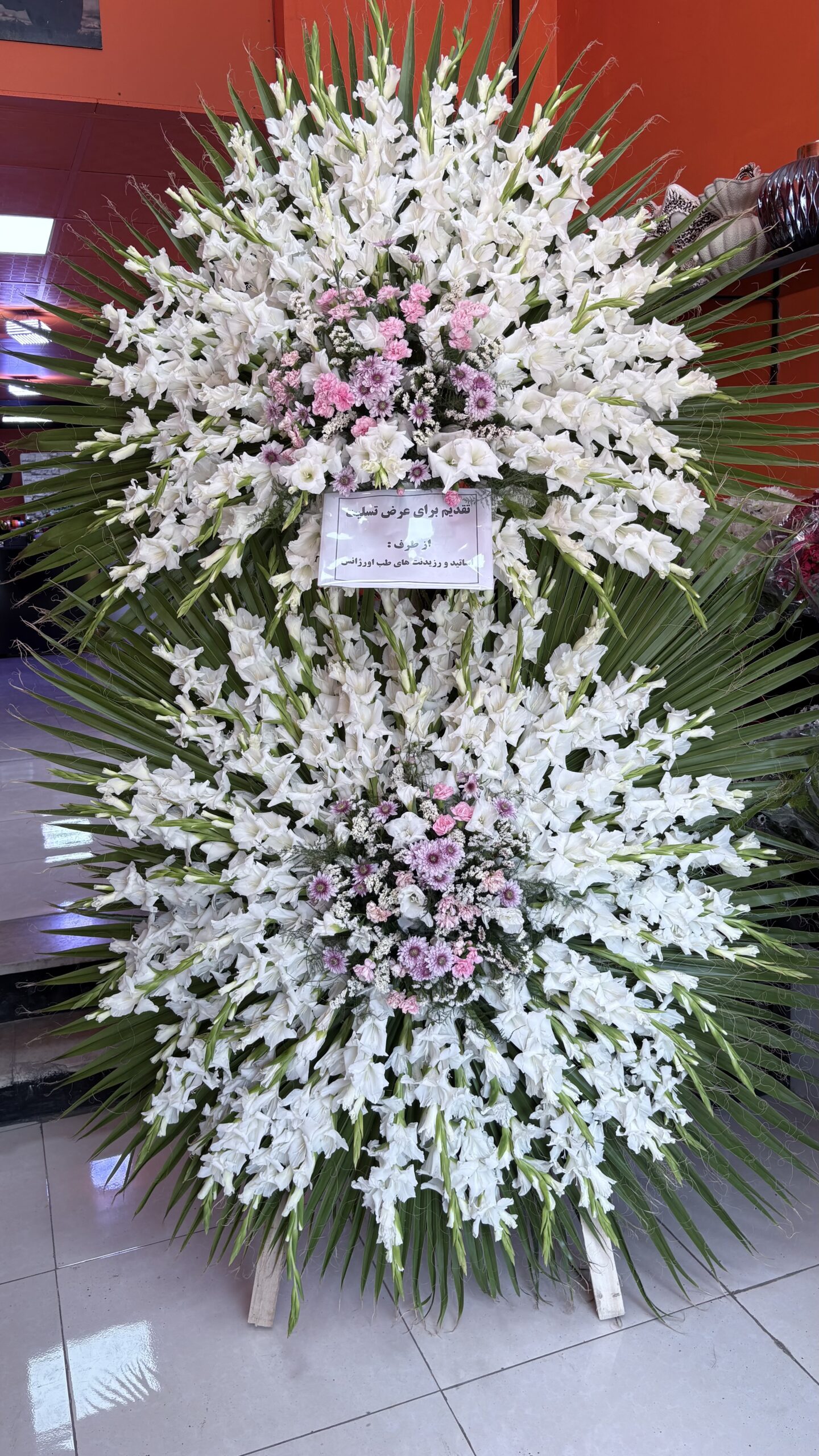 تاج گل دوطبقه ترحیم با ترکیب گلهای طبیعی، رنگهای هماهنگ و طراحی مدرن، تجربهای از شکوه و آرامش را برای چشم و دل به ارمغان میآورد.