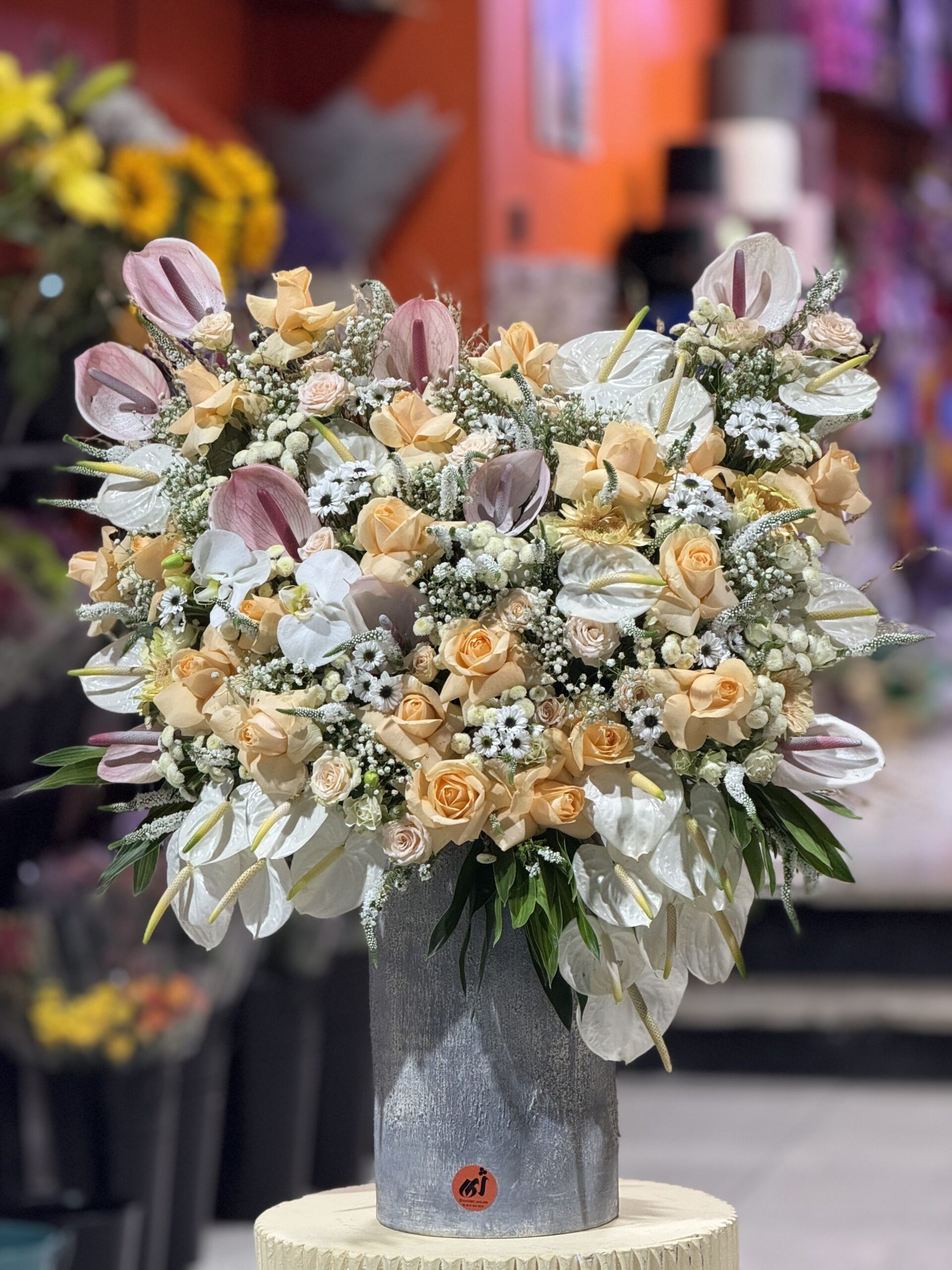 آنتریومهای براق و کرزنتیاهای خاص در مرکز جام میدرخشند ✨. رزها پیام عشق و احترام را با صدای بلند منتقل میکنند 🌹. رزمینیاتوریها نیز ظرافت را در این چیدمان به اوج میرسانند.