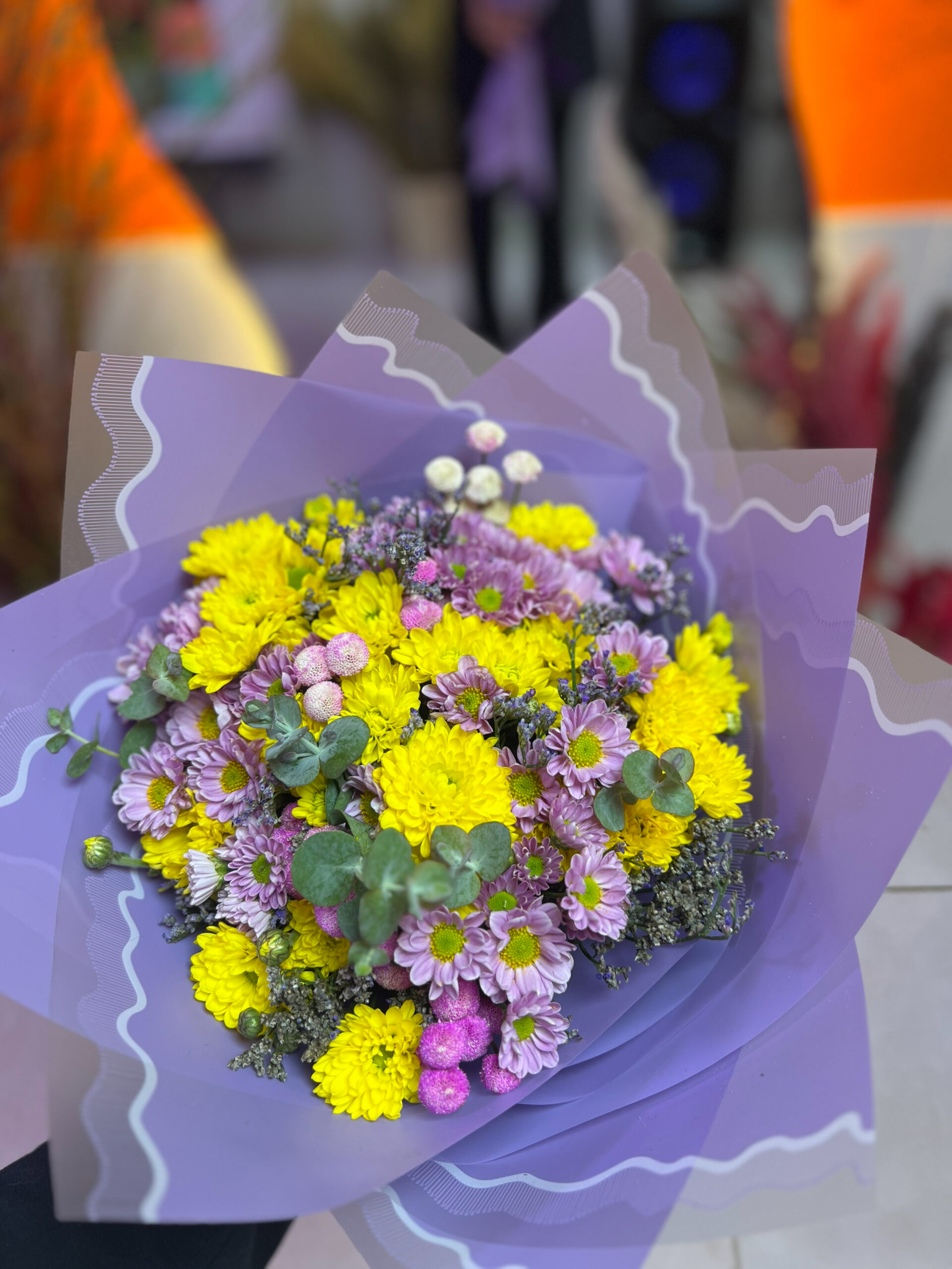 دستهگل داوودی، شکوهِ آرامِ پاییز را در دلِ خود پنهان دارد؛ ترکیبی از داوودیهای زرد، کرزنتیای گلبهی، سفید و صورتی و اکالیپتوس که چون شعری در رنگهای طبیعت، از زندگی و روشنایی سخن میگوید. 🌼