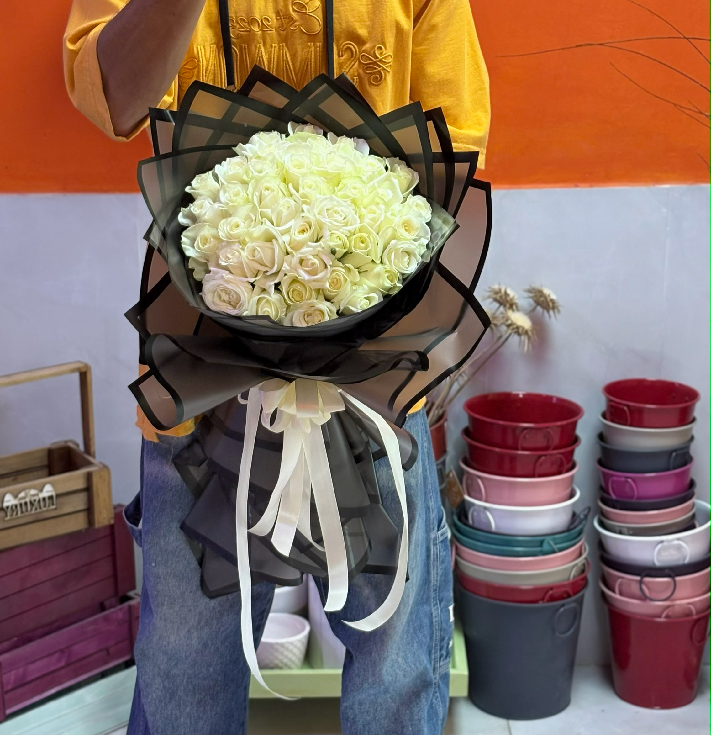 آنچه این ترکیب را لوکس‌تر و متمایز می‌کند، انتخاب کاغذ مشکی با لبه‌های مشکی است؛ بستری فاخر و شیک برای پیدایش تضاد چشم‌نواز رنگ‌ها. مشکی، راز و عمق را به هم می‌بافد و زیبایی رزها را همانند جواهرات نفیس در قاب هنر نمایش می‌دهد.