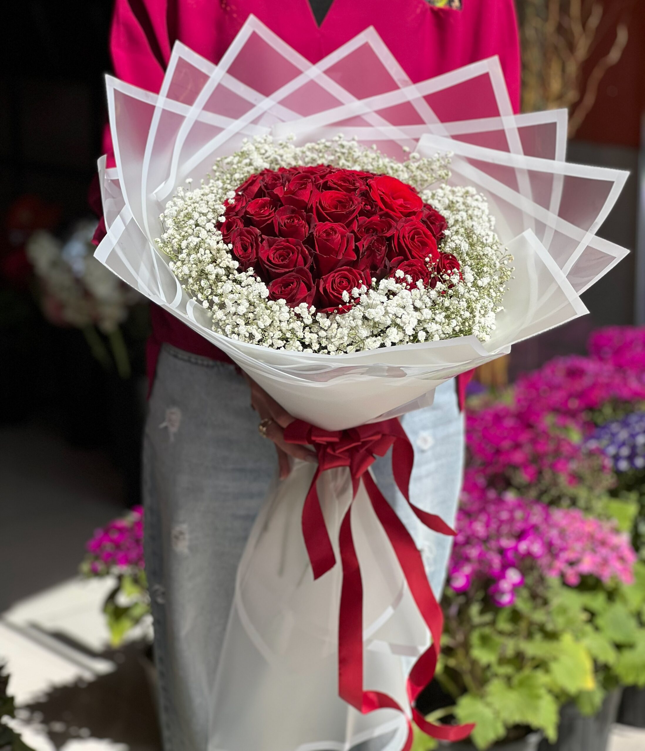 در قلب این اثر، رزهای قرمز چون شعلههایی از احساس میدرخشند — خالص، باشکوه و پرقدرت. در نگاهشان پیامی از دلدادگی نهفته است؛ عشقی بیانتها که با هر لبخند زنده میشود. کنارشان، ژیپسوفیلا چون مهی سبک از سپیدیِ لطیف، لطافتِ عشق را در هوای خوشِ لحظهها پخش میکند؛ بیادعا اما درخشان، آرام اما تأثیرگذار.