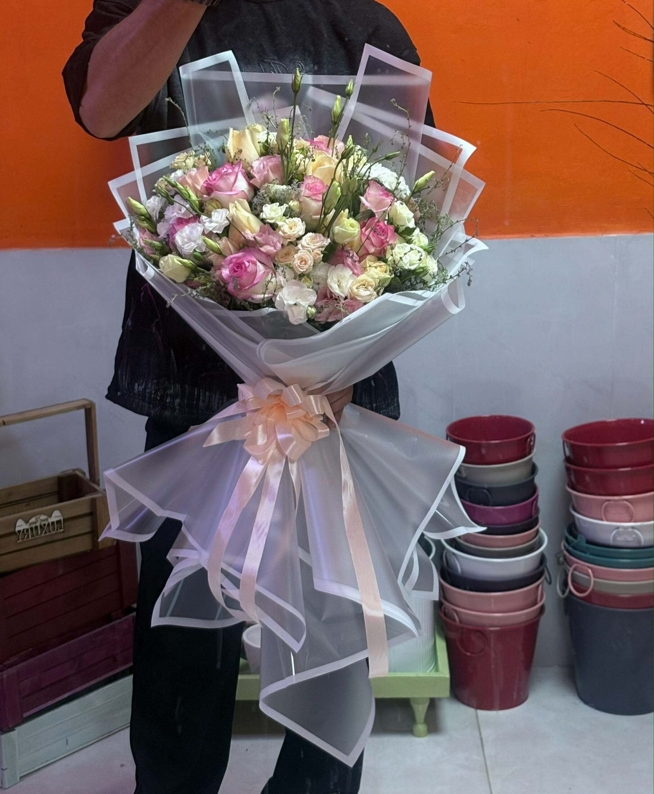 در این چیدمانِ رمانتیک و فاخر، رزهای لب صورتی و نباتی، با درخششِ نرم و دلنشین، همچون بالهای پروانهای از عشق و آرامش میرقصند. رنگِ لبصورتی از دلِ لطافتِ بوسهها برآمده؛ و رزِ نباتی، گرمایی از شکوهِ کلاسیک را در جانِ دستهگل جاری میکند. در کنارِ آنها، رزهای مینیاتوری با غنچههای ظریف و پر احساس، روحی جوان و شاعرانه به اثر میدهند — لطافتی بیپایان، میان شکوفه و رؤیا.