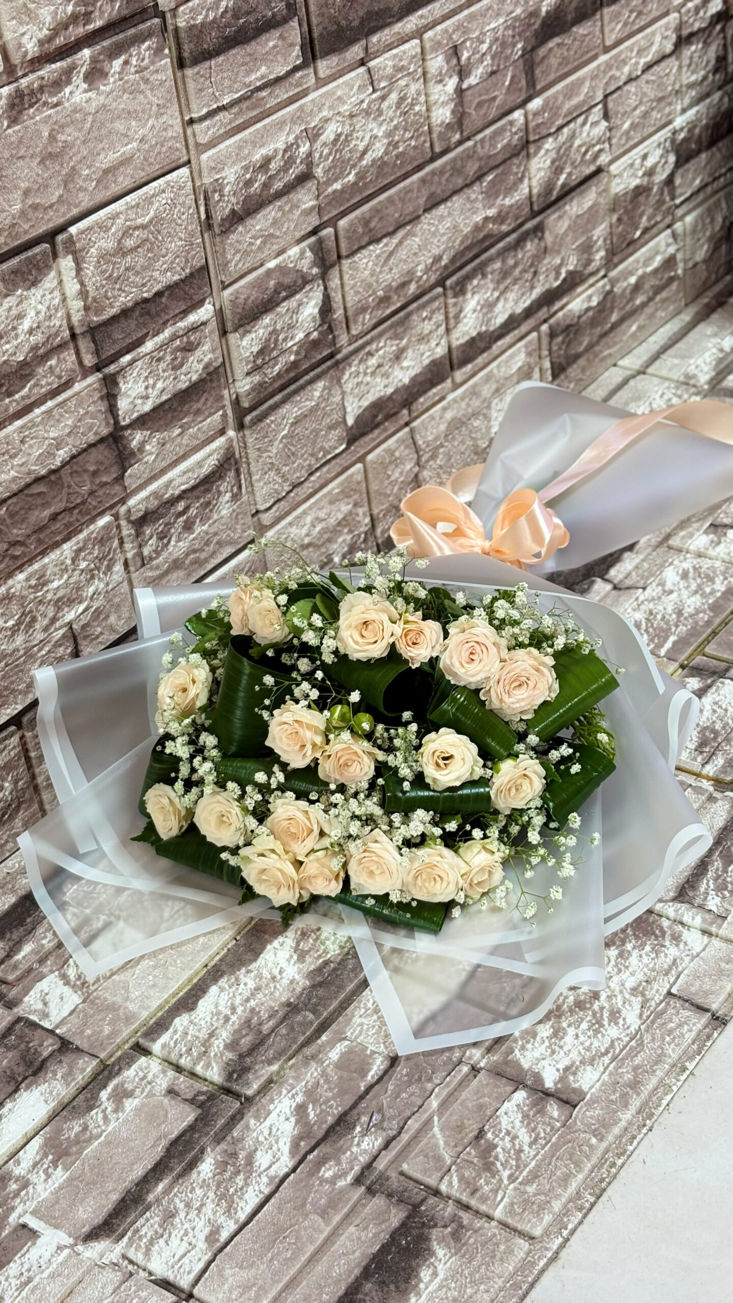این طراحی کوچک و هنرمندانه، با رزهای مینیاتوری آغاز میشود؛ گلهایی که با غنچههای ظریف و رنگ ملایم خود پیام عشقِ بیادعا را زمزمه میکنند. حضور ژیپسوفیلا چون نسیم سپید و سبک، لایهای از لطافت و رویا را بر تمام ترکیب میگستراند.