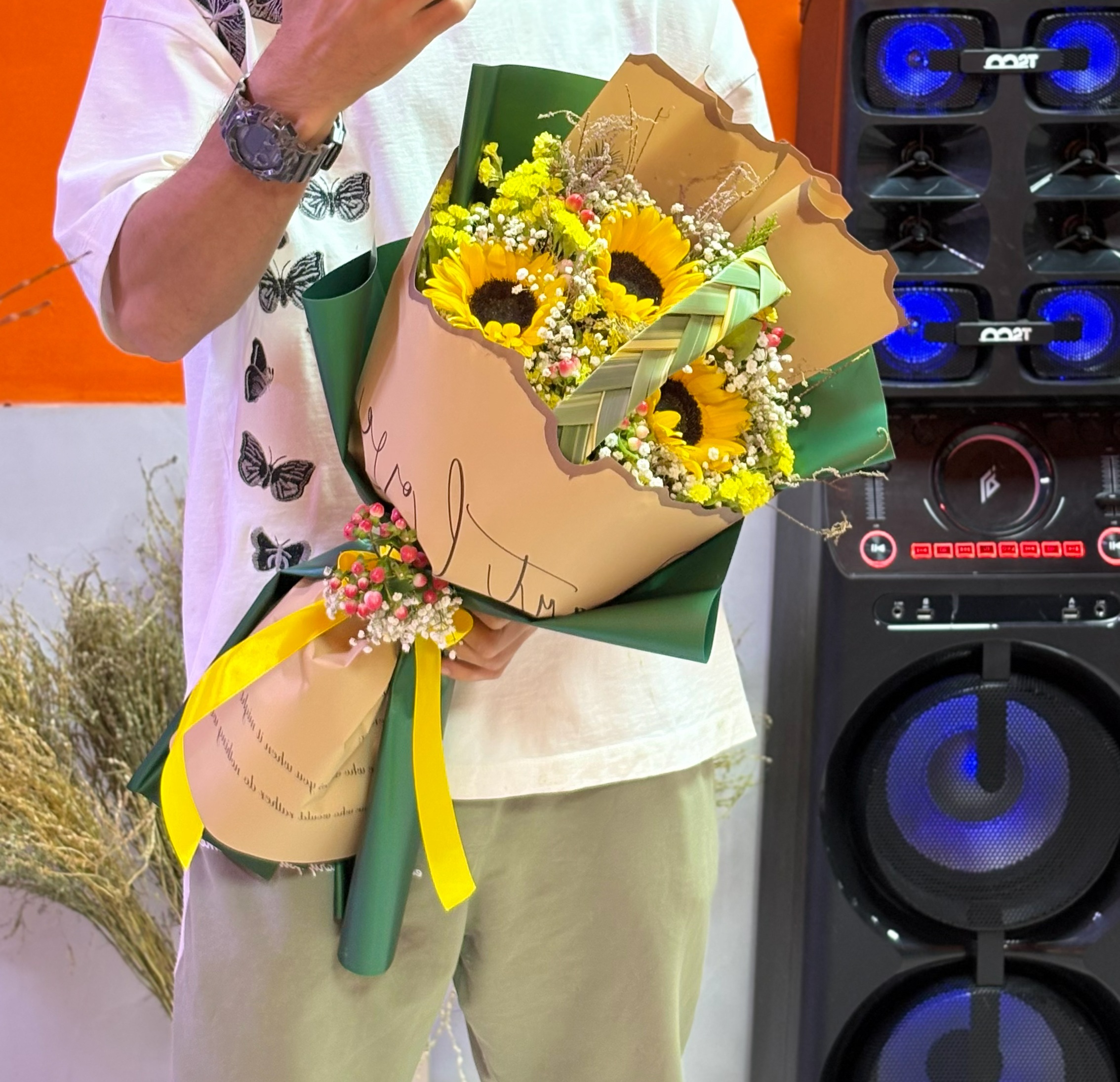 گل‌هایی که از دلِ صبح برآمده‌اند تا لبخند را دوباره به چهره‌ی جهان بازگردانند. آفتابگردان، با قامتِ بلند و قلبِ روشنش، نمادِ باور و پایداری‌ست — گلِ عاشقی که به هر نورِ تازه سلام می‌کند. در کنار آن، استاتیس و ژیپسوفیلا با لطافتِ خالصِ خود، فضایی ابریشمی از آرامش می‌بافند؛ عطرِ بی‌وزنِ خاطراتِ سپید که میان شاخه‌ها جاری‌ست. حضورِ گل‌های فصل، لطافتی زنده به این ترکیب می‌افزاید؛ نشانه‌ای از زندگیِ در گردش و زیباییِ بی‌پایانِ طبیعت.