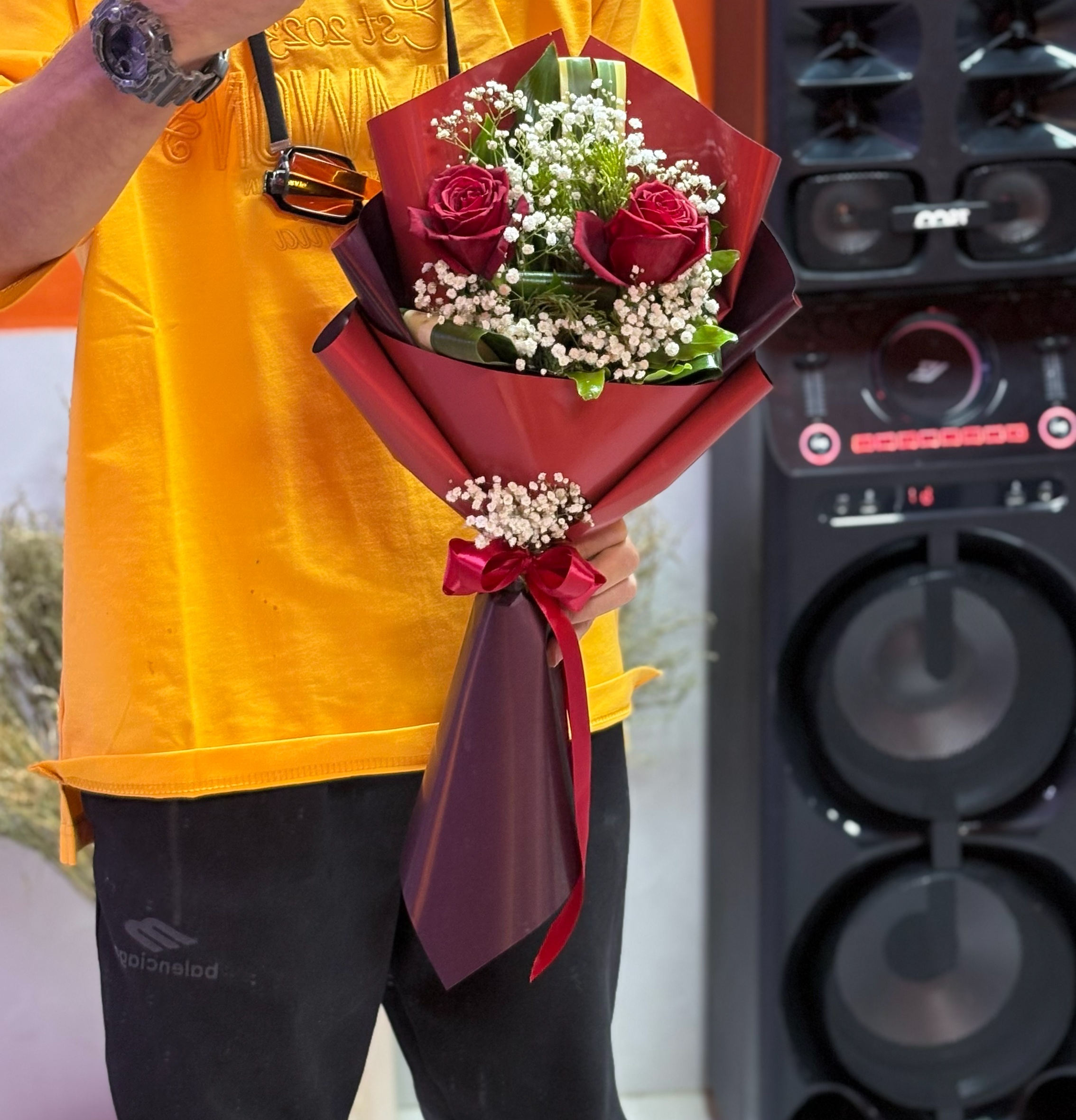تمامی این زیبایی‌ها در آغوشِ کاغذ ضدآب زرشکی آرام گرفته‌اند؛ رنگی اشرافی با طبعی خاص، که حرارتِ عشق را در قالبی لوکس تصویر می‌کند. در پایان، روبان ساتن زرشکی با درخششی مخملی بر دورِ دسته گل می‌پیچد — مانند گره‌ای عاشقانه که داستانِ احساس را کامل می‌سازد.