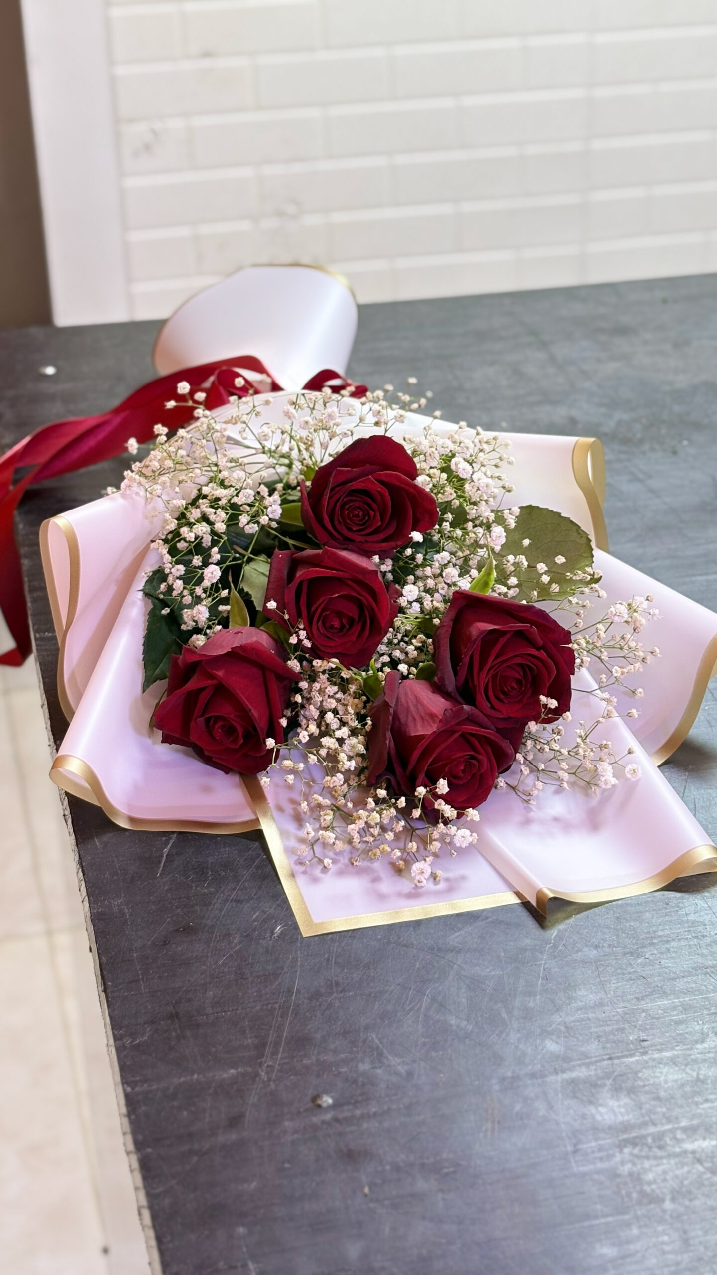 روبان ساتن زرشکی با درخششی ابریشمی، چون خاتمهی یک شعر عاشقانه، به آرامی در میانِ گلها نشسته است — پایانی فخیم بر داستانی که از نگاه آغاز میشود و در قلب امتداد مییابد.