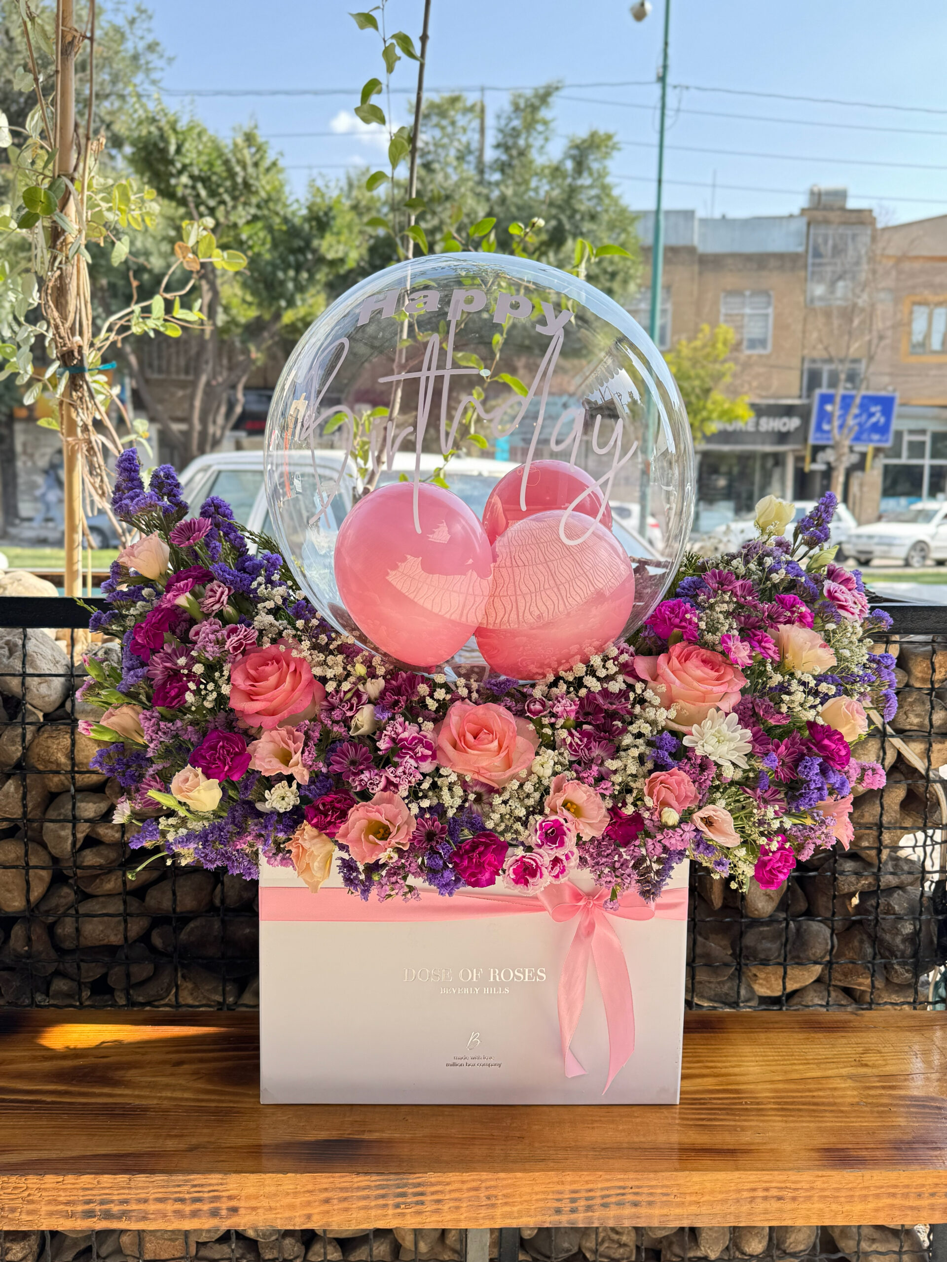 فشن باکس مربع تولد با ترکیب گلهای طبیعی، رنگهای هماهنگ و طراحی مدرن، تجربهای از شکوه و آرامش را برای چشم و دل به ارمغان میآورد.