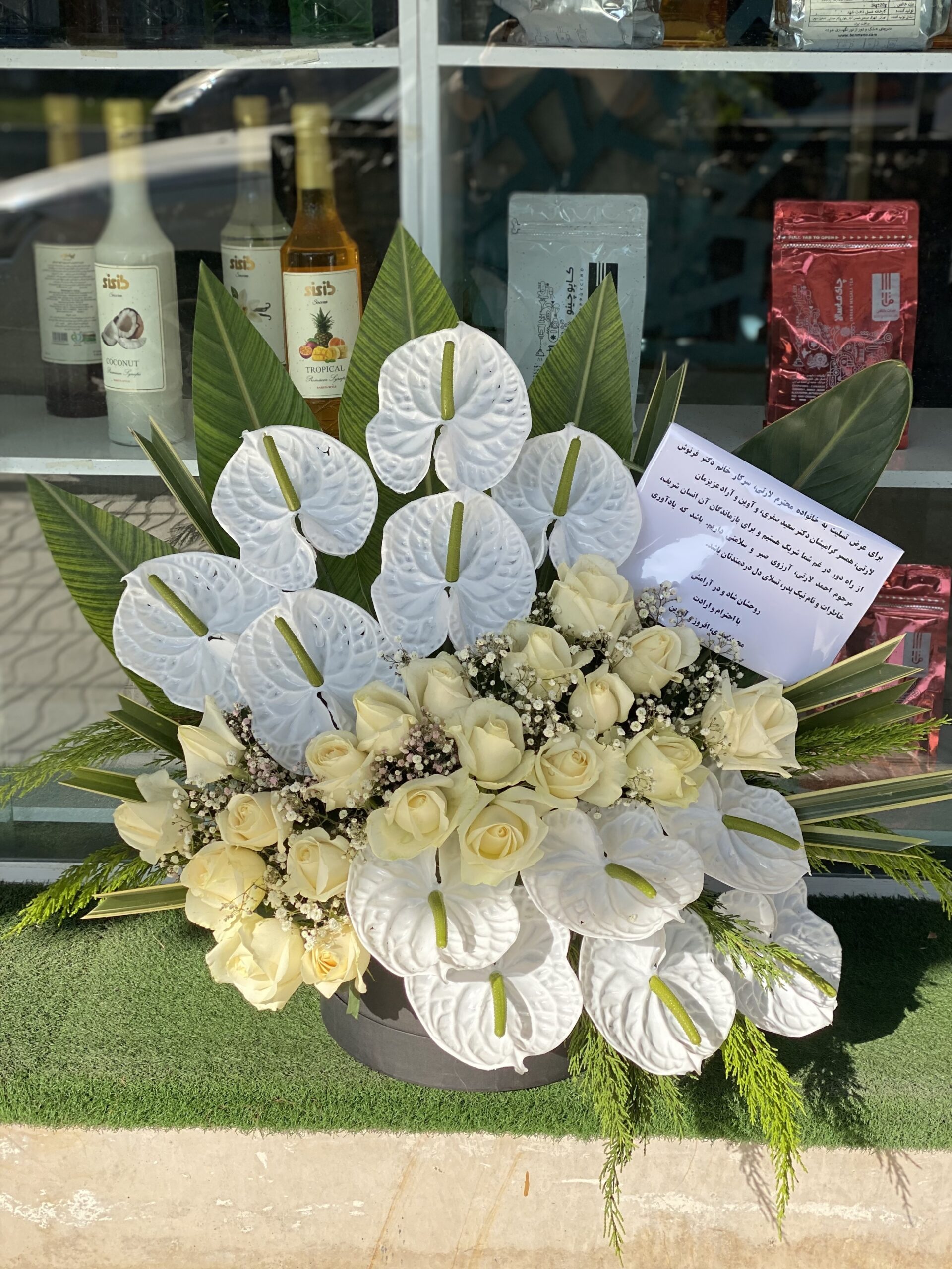 در مرکز چیدمان، آنتریومهای سفید و براق با فرم قلبیشکل، پیام پاکی، عشق و احترام عمیق را منتقل میکنند. پیرامون آنها، رزهای کرم و سفید بهعنوان نماد عشق بیانتها، لطافت و احساس صمیمی قرار گرفتهاند. ژیپسوفیلاهای ریز و لطیف در میان گلها چون غبار آرام دعا، حجم و لطافت کار را تکمیل کردهاند و با اشکال دانهای خود جلوهای رؤیایی به باکس میبخشند.