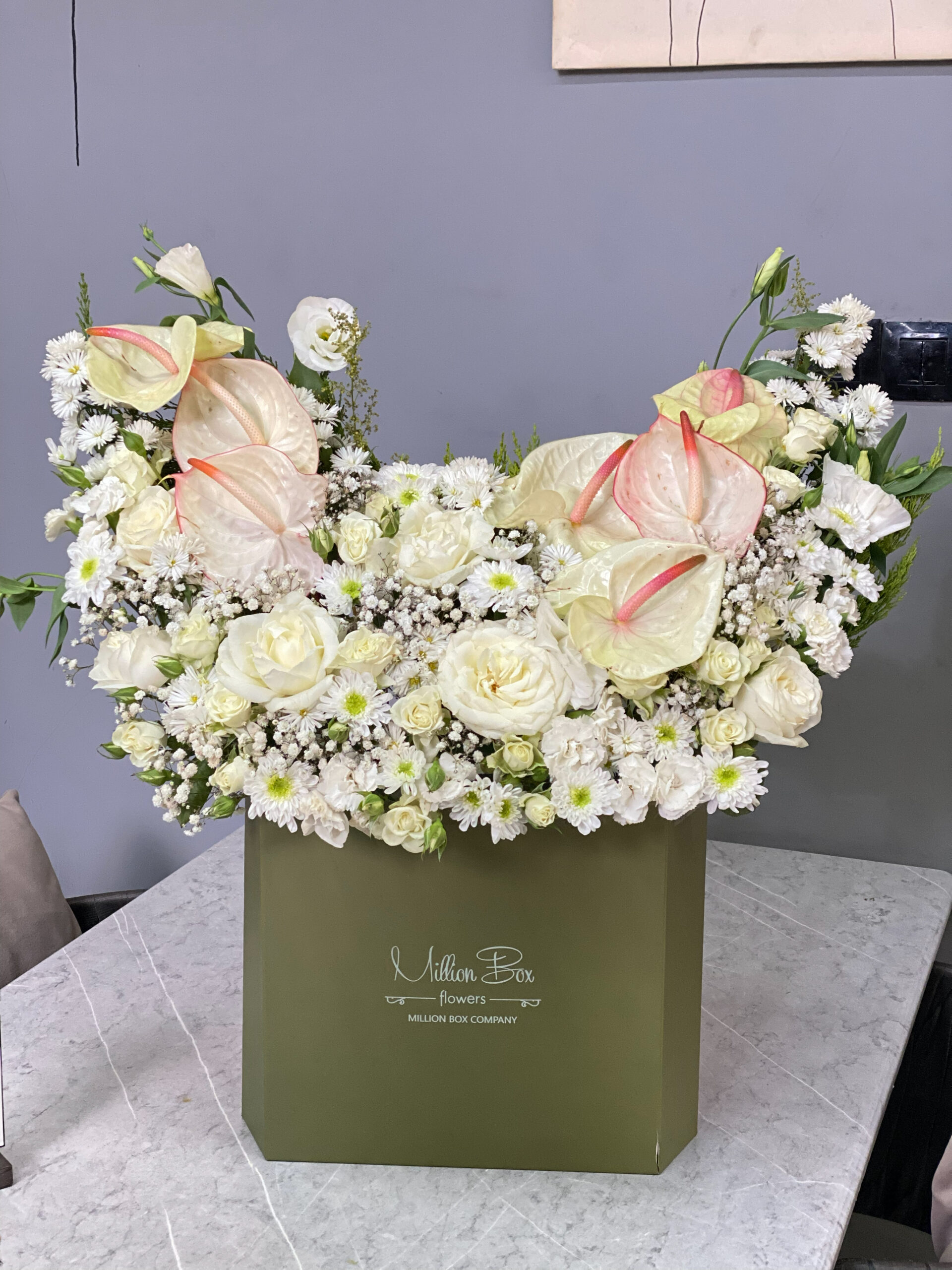 باکسی که با فرم منحصربهفردش، نگاه را به مرکز زیبایی میکشاند. رزهای دلانگیز، با رنگهایی از عشق و وقار، قلب ترکیب را ساختهاند؛ آنتریوم با درخشش خاص و باوقارش، بیانی از جسارت و اصالت است.