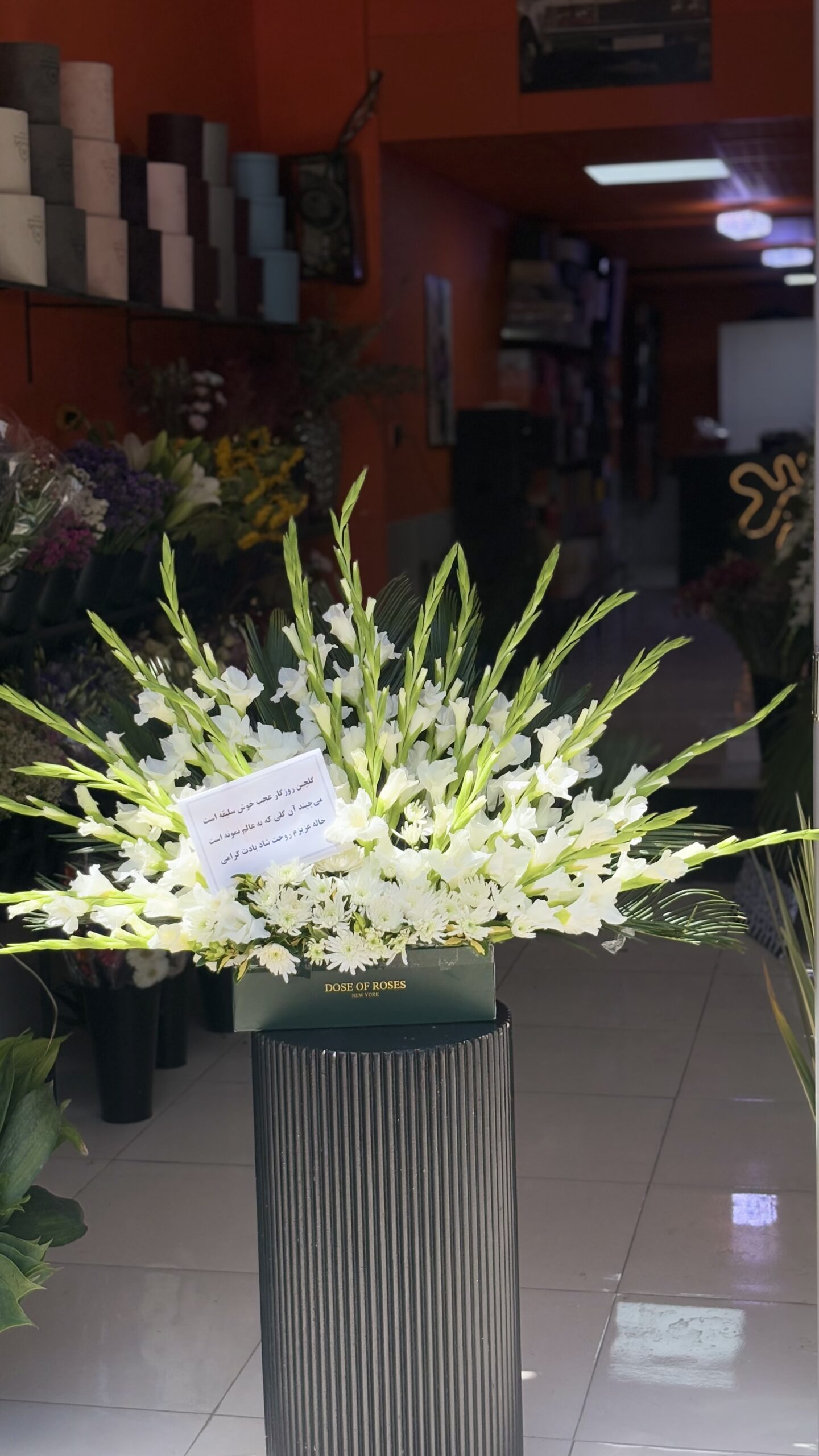 گلایول، با قامت کشیده‌اش یادآور سربلندی و بزرگ‌منشی است. داودی‌های سپید، آرامش جاودانه را در فضا می‌پراکنند. در کنار هم، تصویری از سکوت، احترام و عشق بی‌کلام به عزیزان رفته می‌سازند. ابعاد ۶۵×۶۵ سانتی‌متر طراحی را متوازن، فاخر و مناسب برای مجالس رسمی و مکان‌های بزرگ کرده است.
