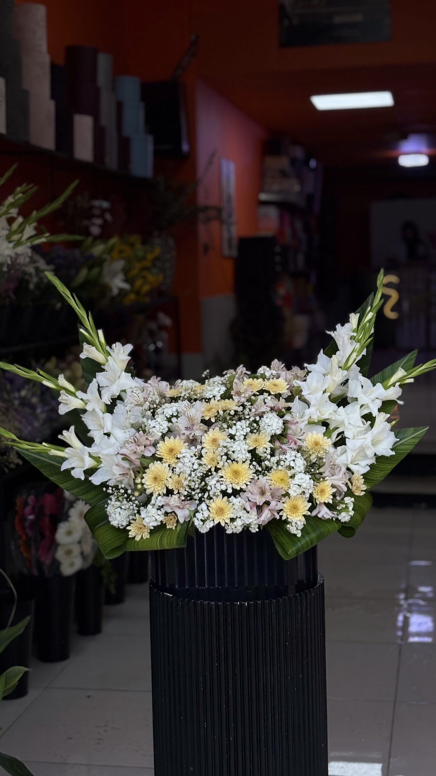 ترکیب گلایولهای سفید، داودیهای آرام، آلسترمریای لطیف و ژیپسوفیلاهای سپید، تصویری از پاکی و سکون میآفریند. گلایول نماد استواری است، داودی بیانگر آرامش جاودانه، آلسترمریا پیام وفاداری و دوستی، و ژیپسوفیلا نماد صمیمیت و سکوت نجیب. در کنار طراحی مدرن کرکرهای، این باکس اثری فاخر و چشمنواز برای مجالس رسمی است.